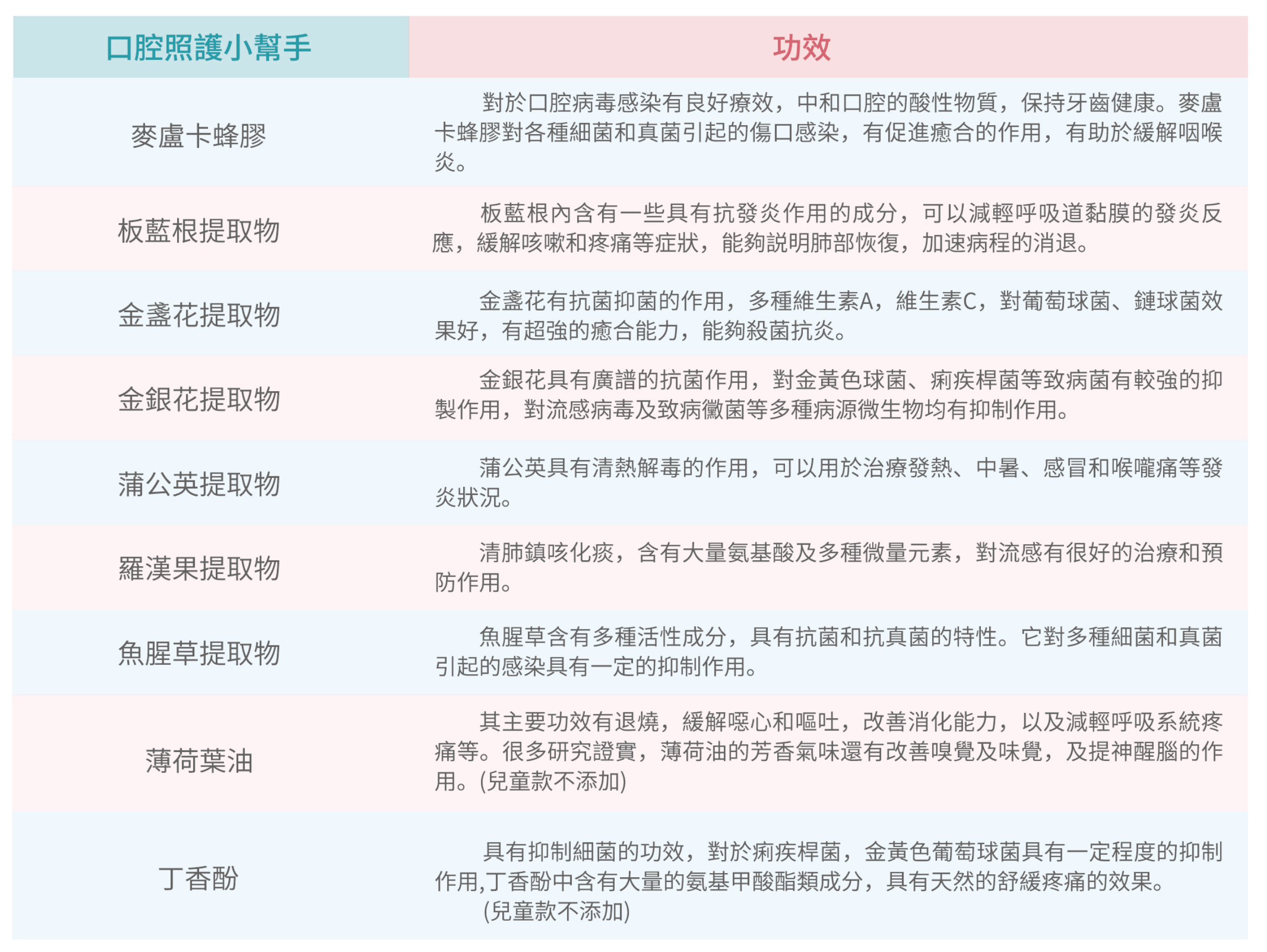 A:含多種草本萃取(金銀花,金盞花、羅漢果、八角茴香果、肉桂樹皮、到手香),另外添加麥盧卡蜂膠,對咽喉消炎殺菌有舒緩效果及減少咳嗽的發生。